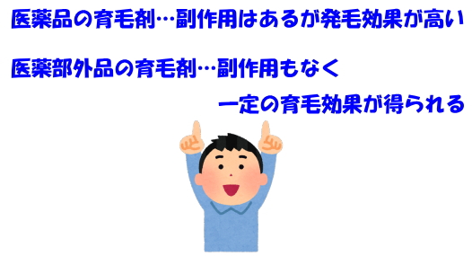 性質に違いがあるので、副作用があっても発毛効果が高いものを使いたいなら医薬品の発毛剤、効果はあっても副作用がない方がいいなら医薬部外品の育毛剤がおすすめです。