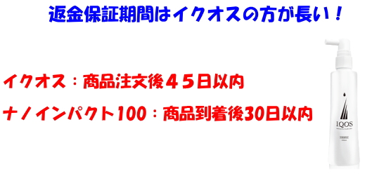 2つの違いですが、イクオスは注文後から45日以内に対してナノインパクト100は商品到着後から30日以内と若干条件が違います。